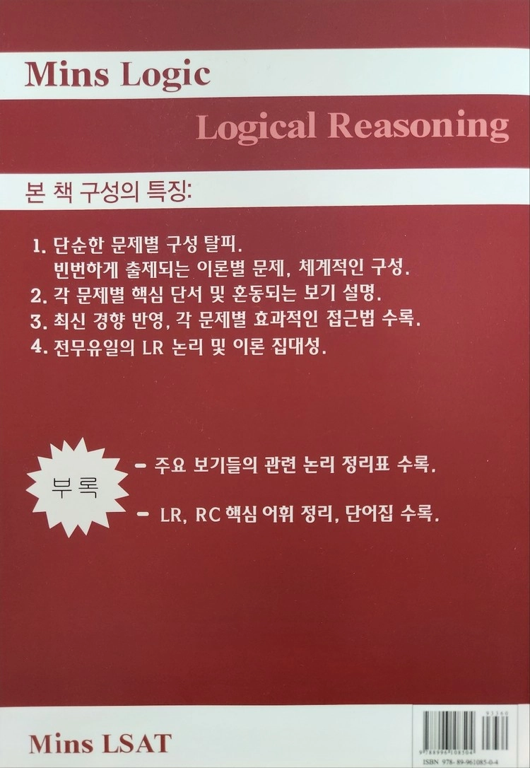 교재 표지 색을 본따서, 일명 빨간책이라고도 부르는 LSAT LR 논리를 총망라한 교재입니다.