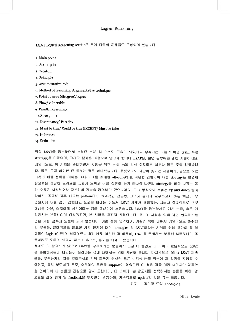 ★ 교재를 구매하신 분들께는, Mins LSAT 까페 등업 권한을 드립니다. 등업 후, 최신 PT 해설을 포함하여 LSAT 시험 및 로스쿨 준비에 도움이 되는 자료를 제한 없이 열람하실 수 있습니다.