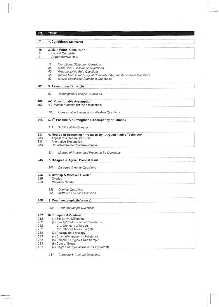 1~50회 초반까지 LSAT LR 기출문제를 빈번하게 출제되는 논리 유형 별로 분류 및 각 논리를 적용한 문제들을 모아놓아, 논리 별 문제들을 반복 학습하면서 논리 및 정답 방향을 집중적으로 학습할 수 있습니다.