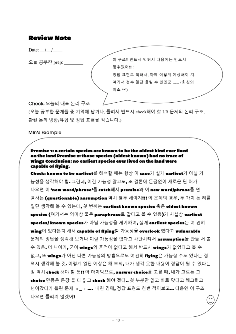 매 챕터마다 LSAT에 최적화된 리뷰 노트 양식과 LSAT 목표 점수 도달을 위한 총체적 공부 방향 및 문제 풀이 팁을 제시하였습니다.