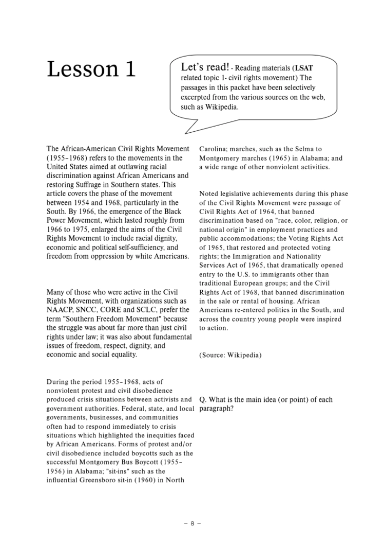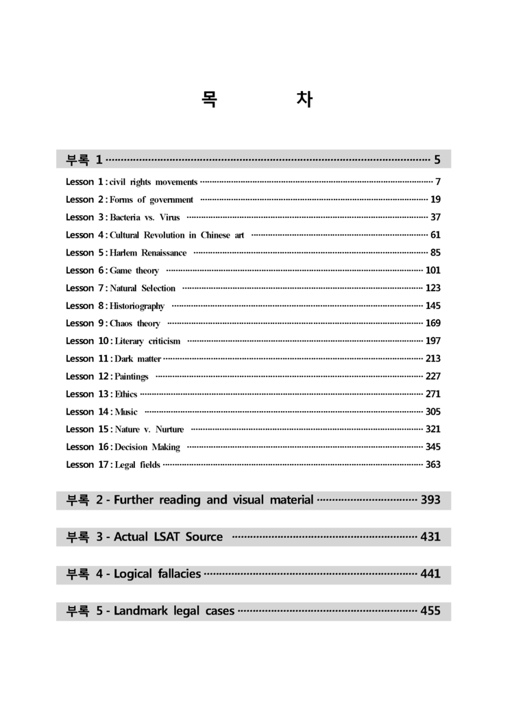 그 외, 실제 기출문제 RC 지문의 출처로 활용된 원문 자료들 일부 수록, LSAT 준비에 도움 되는 논리 오류들 자료, 알아 두면 도움 되는 미 대법원 판례들 및 LSAT 대비 핵심 단어장까지 전부 부록으로 수록되어 있습니다.